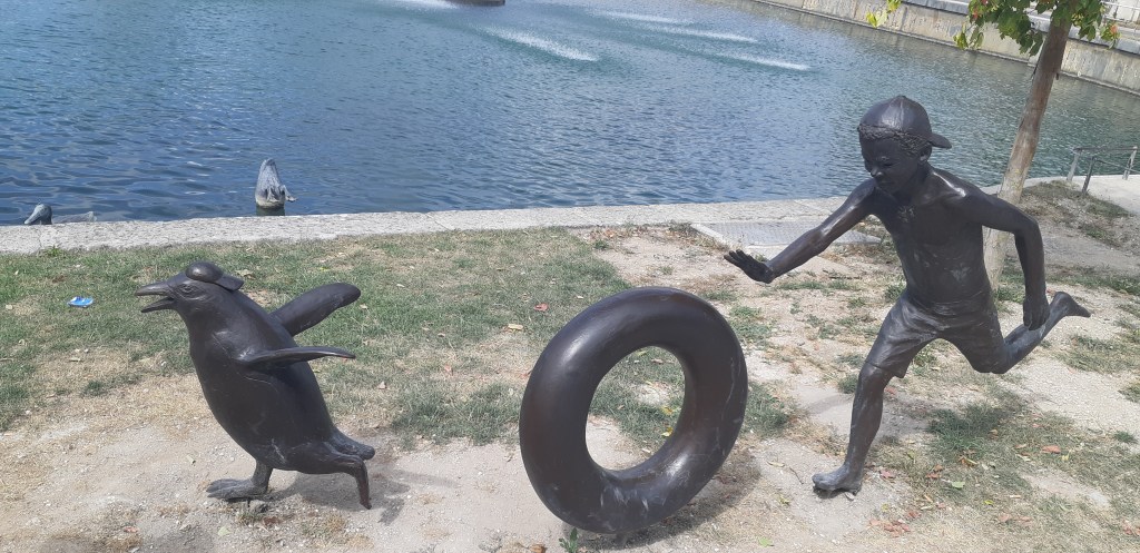 Cette œuvre est justement située sur le Quai La Fontaine. Elle représente un groupe d’enfants qui courent se jeter dans les eaux de la Seine pour s’y baigner. Certains d’entre eux sont sur la terre ferme d’autres sont déjà dans l’eau. Il se dégage de cette sculpture une impression de mouvement et d’énergie renforcée par le fait que le sculpteur a su parfaitement adapter son œuvre au lieu où elle devait être exposée. D’ailleurs, l’artiste belge Tom Frantzen est connu et reconnu pour ce type de réalisations.
