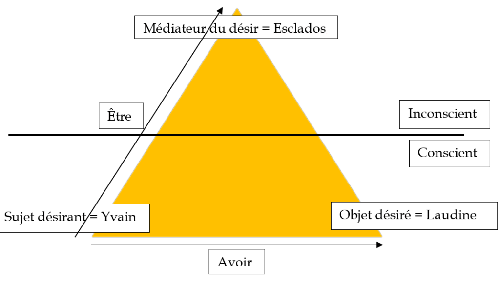 On comprend mieux le désir et l’amour qu’Yvain ressent quand on a en tête la théorie du désir mimétique de René Girard (si vous avez l’impression que je parle grec ancien, pas de panique, cliquez sur le lien, c’est expliqué plus clairement https://www.philolog.fr/le-desir-mimetique-rene-girard/ ). En quelques mots, un objet nous semble désirable, non pour lui-même, mais parce qu’il est désiré par une autre personne que nous admirons. C’est donc cet autre-là qui confère de la valeur à cet objet. Cette théorie peut être schématisée de cette manière :